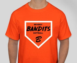 100% Cotton shirt Orange, Black or Grey cotton shirt Beverly Bandits home plate logo screen printed on front of shirt AS-2XL